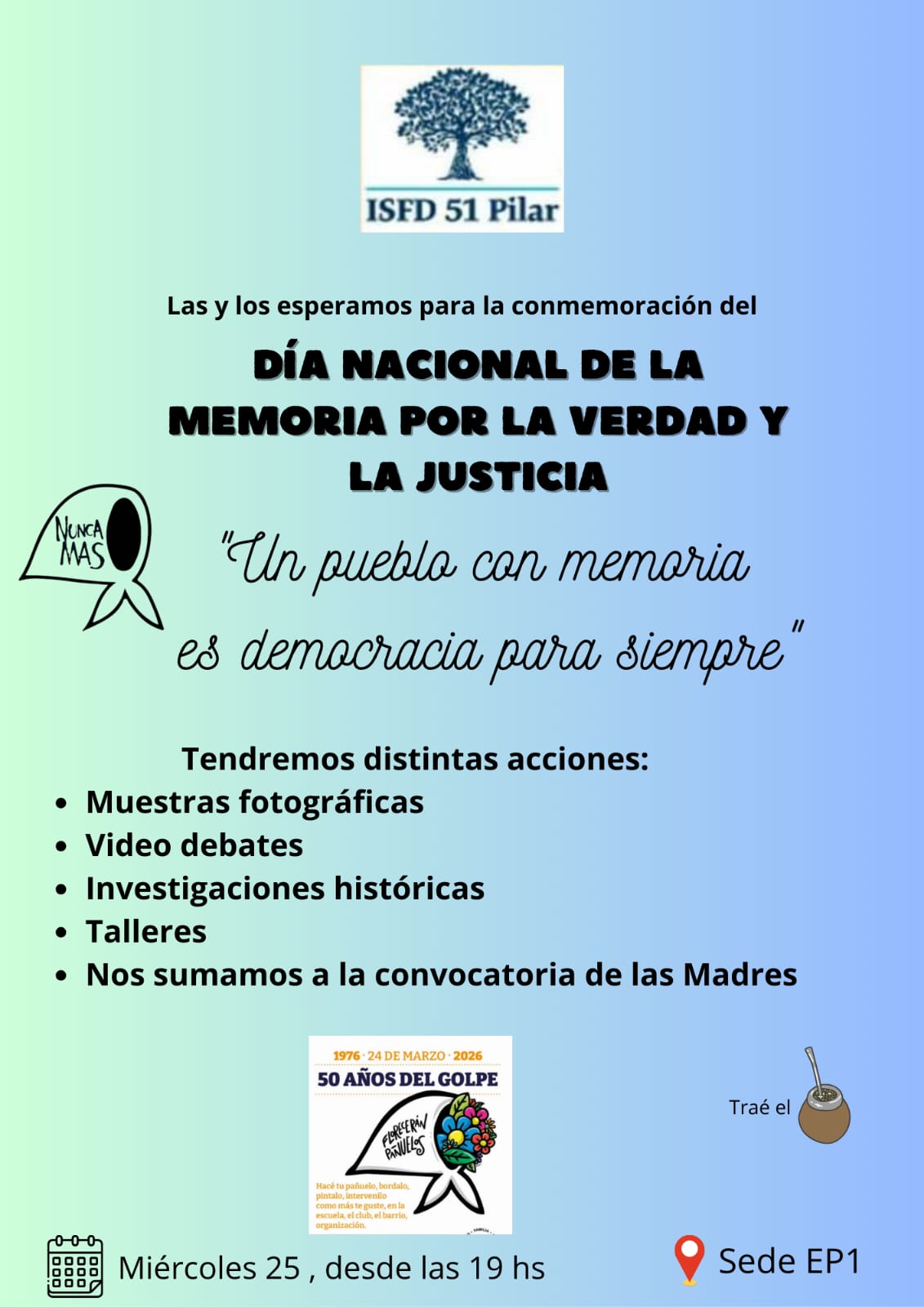 Hoy, miércoles 25-03-2026 nos encontramos en la Sede de la EP N° 1 del ISFD N° 51 a la 19:00 hs. para conmemorar el Día de la Memoria por la Verdad y la Justicia – a 50 años de la Dictadura Cívico Militar Eclesiástica.